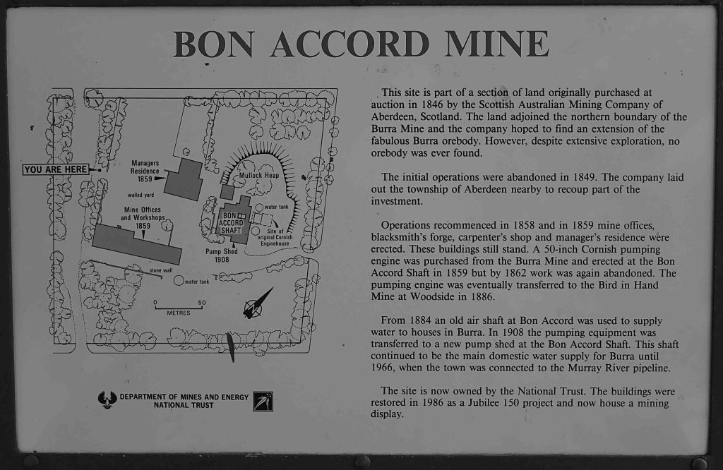 The Burra mine, owned by SAMA, struck a valuable copper ore body and operated between 1845 and 1877. The Bon Accord mine did not find a commercially viable ore body, and partially closed in 1849, abandoned in 1862. The Nobs also had little success and closed in 1851.