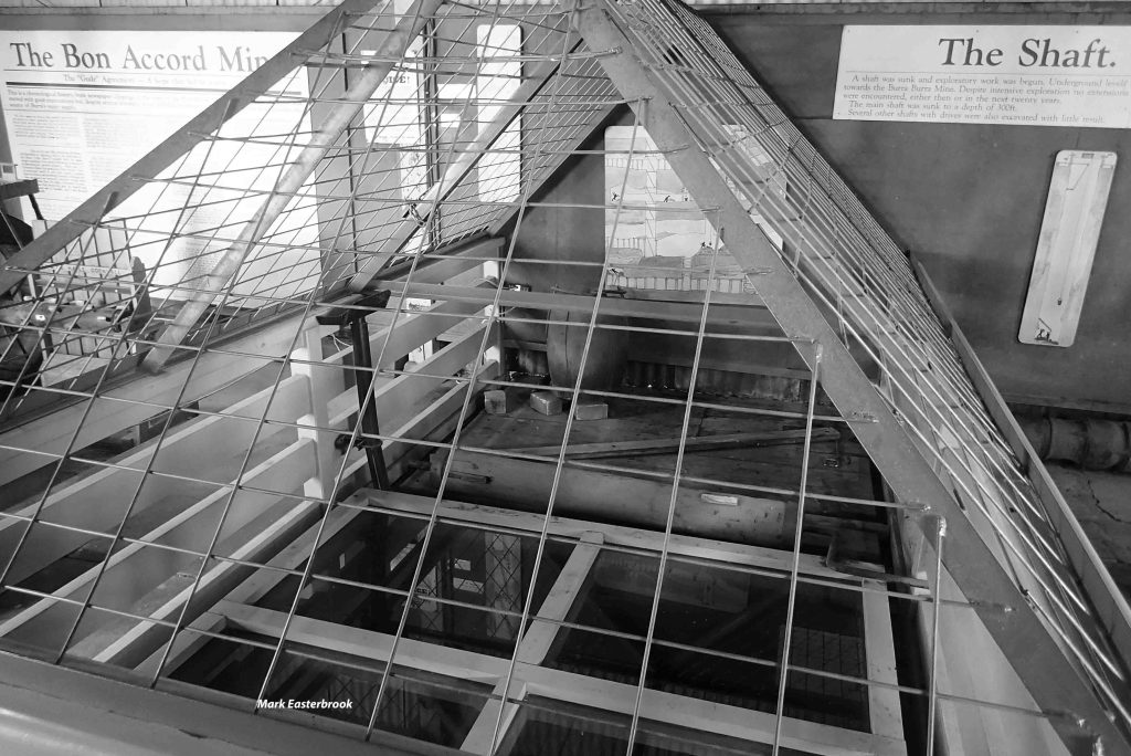 The main shaft of the Bon Accord mine had struck water during its time of operation, and a very large Cornish-built pump was installed to keep the miners heads above water.