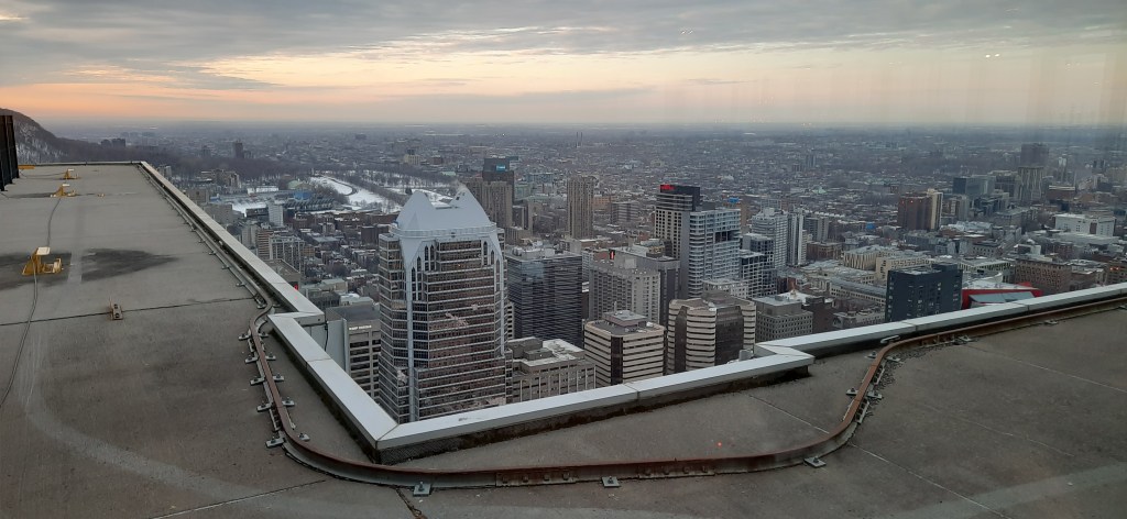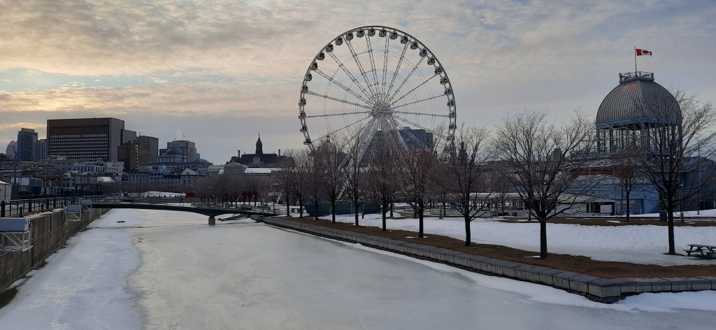 The walk around the Old Port, with the Saint Lawrence River flowing past, is worth an evening stroll. Ice was still covering the berths where the summer boats moor. Small ice-burgs were still flowing down the river, on their very long journey to the ocean. The winter colours, fading light and city-scape make for some excellent photograph opportunities for those with cameras of all abilities. The Montreal Eye and Canadian flag standing proudly above the city.